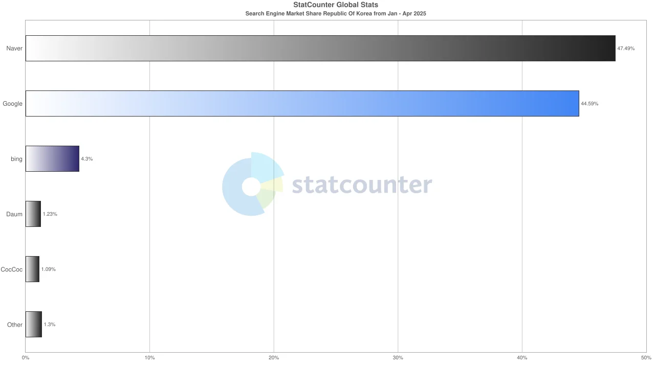 국내 시장에서도 2025년 4월 기준 네이버가 47.49%, 구글이 44.59%로 거의 비슷한 점유율을 보이고 있습니다. 구글의 점유율이 지속적으로 증가하는 추세라 국내 기업들도 구글 SEO를 더 이상 간과할 수 없는 상황입니다.